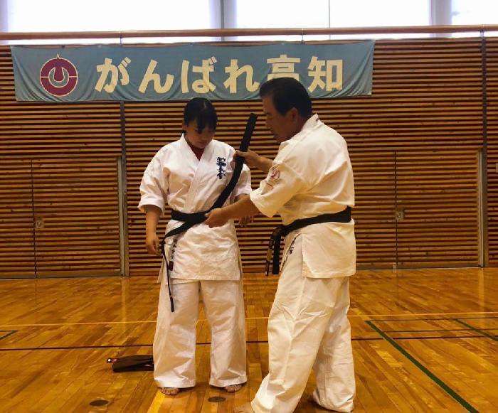 愛佳の黒帯が届きみんなの前で締めてあげました。